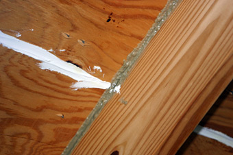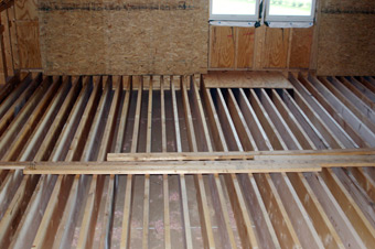 Ever try getting 24’ floor joists into a second-story room with only two hard-to-access windows? Good for you if you haven’t! But it had to be done in my case. The structural engineer specified doubling the number of floor joists from 2" x 12" lumber spaced 12" on center to 6" on center. This would not only increase the load-bearing capability of the floor but would also stiffen it greatly. Personal note: I can’t stand flex in a floor, so this was a welcome suggestion. Whether it actually creates sloppy, boomy bass or not, a squishy floor would not sit well with me.