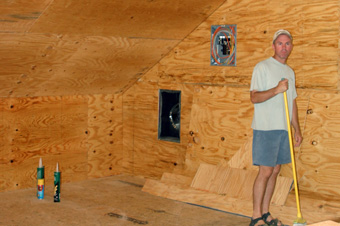 The rest of the initial room-construction details involved a number of steps designed for sound isolation and strength. The walls and ceiling would consist of three layers: one of plywood and two of drywall. The layers would all be glued and screwed together, creating a very rigid, massive wall system. The flooring would be comprised of multiple layers as well, and all seams throughout the room’s shell would be filled, creating essentially an airtight room.