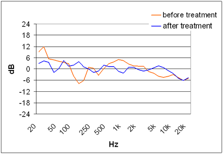 The Music Vault was complete, and I was sitting in my chair with my reference stereo system set up, finally listening to music. I was enjoying, on the one hand, incredible satisfaction that I could play music in my home with a degree of accuracy and realism several notches above anything I had heard before -- in my home or anywhere else: The Music Vault was simply the most stunning sound-reproduction upgrade Id ever experienced -- far greater than any single component change Ive made to my system through the years. This includes the significant move to my current reference loudspeaker, the Wilson Audio Specialties Alexandria X-2, from my previous reference, Wilsons X-1 Grand SLAMM Series 3. From the opening bars of the first discs I played, I was confident that I was in uncharted territory. I was hearing a closer approximation of the real thing -- a sound that simply screamed jaw-dropping focus and unlimited, utterly clean dynamics. At the same time, there was an easiness to the presentation that completely relaxed my mind and soul. I chuckled out loud with contentment. For the obsessive audiophile, however, moments such as this raise more questions than they answer. Listening in the Music Vault that first night made me rethink being an audiophile -- heck, even an equipment reviewer -- at least in the classical sense. In a moment, I realized what a true order-of-magnitude improvement could mean to the art of reproduced sound, vs. what, in the past, Id thought were significant improvements. I had to conclude that, compared with a room-acoustics upgrade such as the one I was experiencing, most equipment upgrades produce only baby-step results. The acoustic output of the system is what we hear. Seem obvious? Then why are acoustics historically given such short shrift by audiophiles? It is the acoustic output of a system in a real room that is by far the most critical determinant of sound quality, not individual electronic components and cables and their "sonic signatures." Perspective As we wound up the third weekend in January -- the culminating point of my room design and construction -- acoustical engineer Terry Montlick and I had an interesting discussion. Terry made an apt analogy that stuck with me, and which I paraphrase: You cannot truly grasp how a car drives without putting it on a road. The way the car interacts with the road determines, to a great extent, the driving experience. In much the same way, a stereo systems interface with the room determines the listening experience. Profound words to this audiophile. We dont listen in anechoic chambers; we listen in rooms, or to rooms, as the case may be. Ive learned that in some cases even radically different speakers can measure similarly because of the room theyre in. Below are the details of how my new room came out and a new attitude surfaced, sprinkled with a few tidbits of advice that might just help you achieve a better quality of sound in your room. Music Vault complete The accompanying photos show 14 polycylindrical diffusers, four corner bass traps, and three sound-absorbing panels, installed in a room 23 6" wide x 20 1" long. I was concerned that the wall-mounted diffusers would adversely intrude on the rooms perceived interior space, creating a closed-in, claustrophobic feeling. I neednt have worried. Although the feel of the room is cozy, its still spacious and interesting -- a far cry from its pre-treatment sterility. A few cosmetic touches helped, such as the maple trim on and between the diffusers. Randall Smith, who supervised the construction, had the idea of mounting the wall outlets on the trim pieces behind the equipment, creating a nice visual effect. Although my wife and I discussed painting the diffusers, the color of the material actually matched the wall color quite well. And with a well-matched fabric for the bass traps and wall panels, the décor turned out to be just right for a mans listening room. The measurements The measurements in many ways only confirmed what I already knew from listening: The room was dramatically improved over its untreated state. Still, the numbers would provide the objective data to support the subjective listening tests -- and would be very interesting to analyze. Measuring equipment in tow, we began playing pink noise in earnest. An impulse-response measurement can reveal problematic early reflections. If any are too high in level, within about the first 15 milliseconds (ms) from the first sounds arriving they can impair razor-sharp imaging of the soundstage. In graph 1 you see the first 15ms. One early reflection, at 1ms (green arrow), is about 1dB too high. Investigation of this had Terry questioning whether it was simply a reflection of sound off the listening chairs back, which was naturally very close to the ears/microphone position. I moved the chair out of the picture and Terry remeasured. That turned out not to be the issue: An early peak did drop out, but was too low in level to be audible; the problem peak remained. Terry finally tracked down the offending reflection to the top pair of sidewall polycylindrical diffusers, which were mere inches away from the Alexandria X-2s tweeters. We temporarily covered the diffusers with pieces of rigid fiberglass that acted as absorbers, and another measurement confirmed that they were indeed the problem. We discussed alternatives to fix this, including adding a small permanent patch of absorption on the diffusers surfaces (yuck). Instead, we toed-in the speakers less than half an inch more, while remaining within Wilsons specs. It worked!