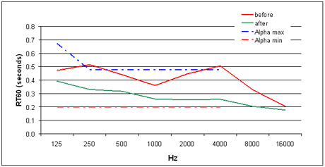 Presented next are the Music Vaults reverberation times. Terry states that the optimum RT60 for a room the size of the Music Vault is between 0.20 and 0.48 second. The Music Vault averaged 0.30 second after acoustical treatment. Terry explains: "Reverberation time naturally goes up with room size, because it takes longer for sound to decay in larger rooms. There are fewer wall reflections over the same time period in a large room compared to a small room. Amazingly, our brains appear to compensate for this, so the room reverberation sounds normal for the room size. And yet this sophisticated mechanism still preserves a perception of the relative liveness or deadness of a space. A 1-second reverberation time for a very large concert hall would likely make that room sound too dead. But the same 1-second reverberation time in a much smaller space, such as a home listening room, would sound too live." The optimal RT60 can even vary with the type of music played; modern, fast-paced, complex music needs somewhat lower RT60 times. Listening tests confirmed that Terrys assessment was correct, however: "My listening tests of old-warhorse Bach and Beethoven showed the rooms reverb wasnt too low. The tracks I played sounded simply amazing."