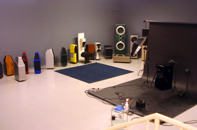 Current and past Wilson Audio Specialties speakers being photographed at the